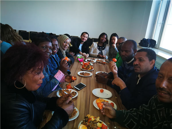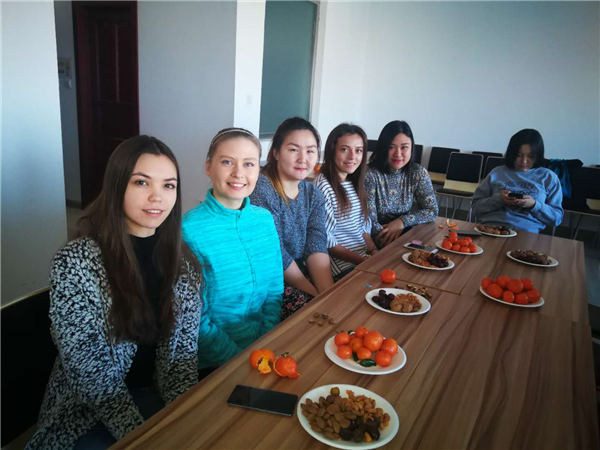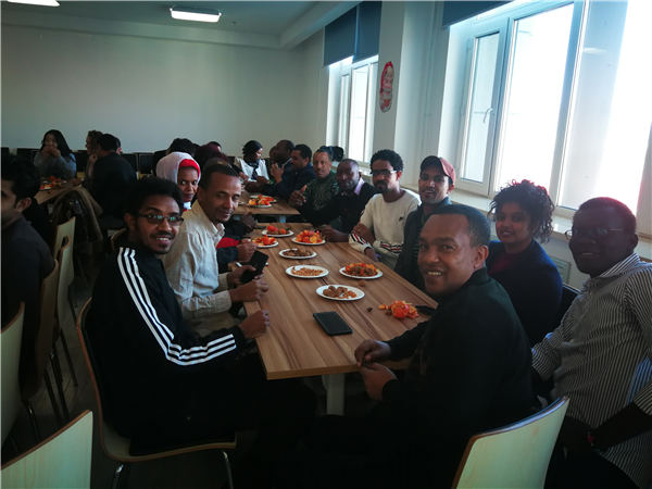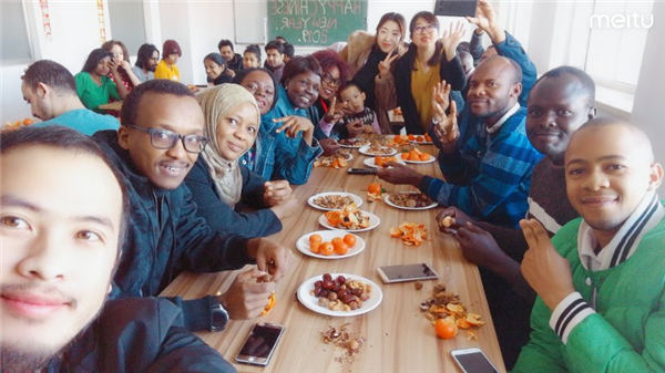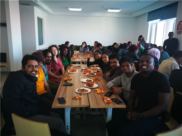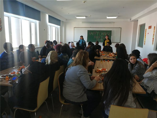 留学生们围桌而坐,畅叙友情。大部分留学生是第一次在中国欢度春节,老师们耐心地给他们讲解中国春节的习俗,留学生们很高兴对中国的文化加深了解。最后大家共祝福哈商大的明天更加美好!