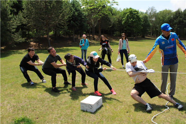 第二个集体游戏是拔河比赛,一会儿是进修生挑战硕士生,一会儿又是俄罗斯男生和韩国男生对决,场面热烈,老师们也按捺不住,加入了拔河比赛的战队。