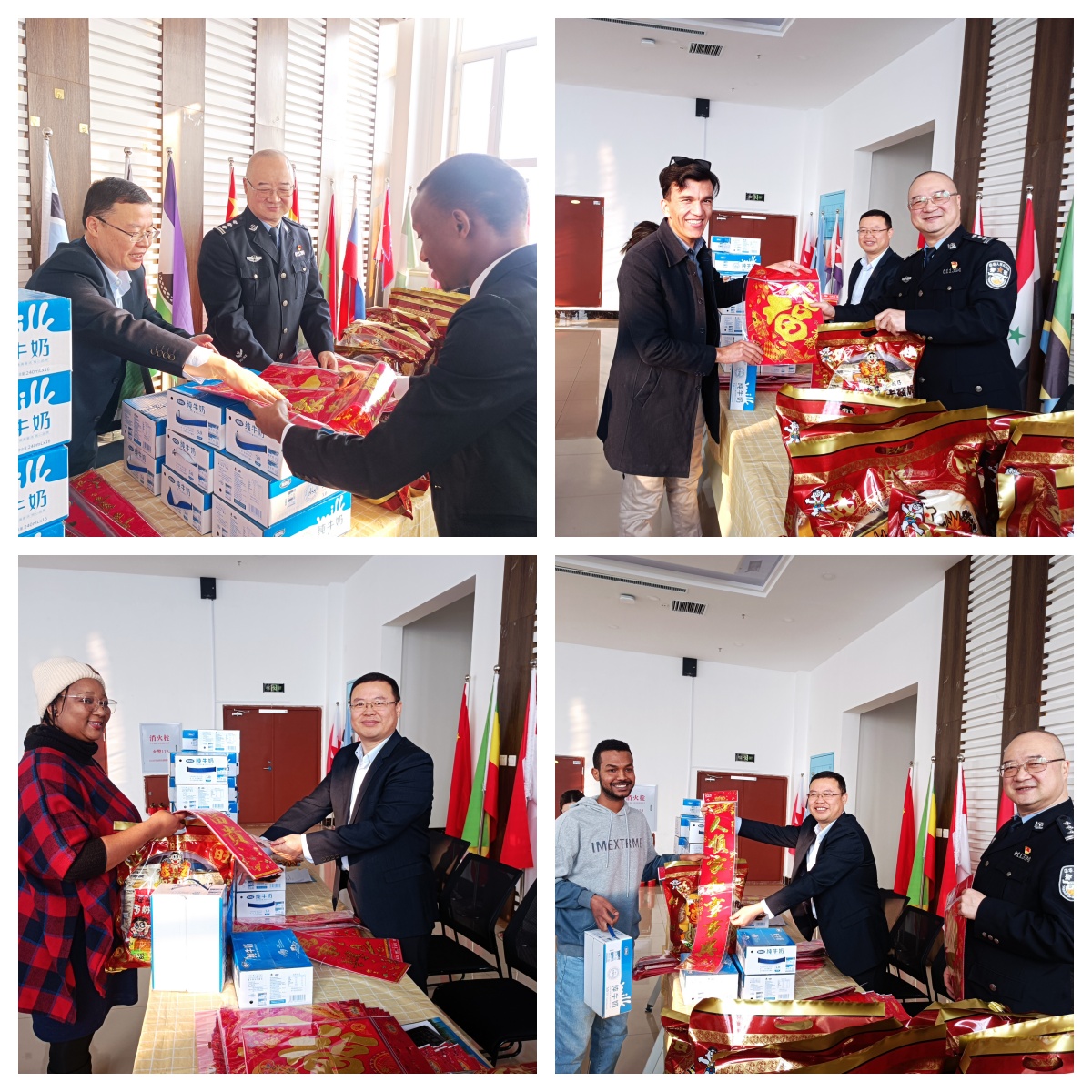在欢快融洽的氛围中,校领导、出入境管理局同志向留学生们赠送了春节礼物,并与留学生一起进行了联谊活动,通过品春联等形式让留学生感知中国传统文化,共度中国传统新春佳节。