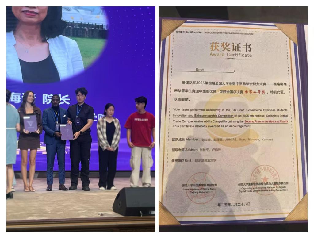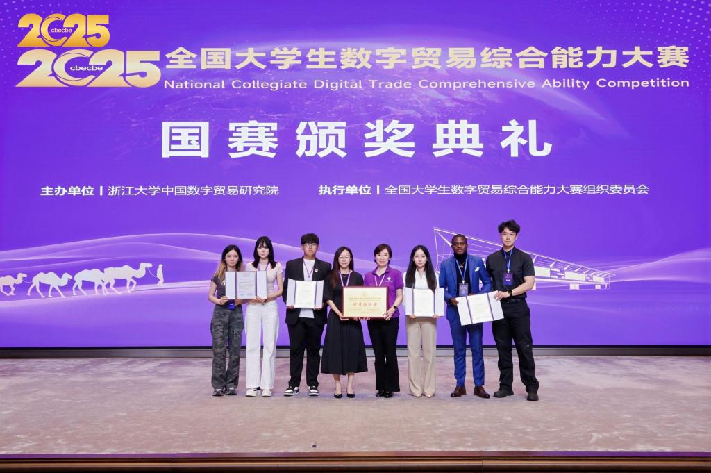 金秋送爽,捷报频传。9月26日至28日,第四届全国大学生数字贸易综合能力大赛全国总决赛在浙江大学隆重举行。我校经济学院副院长杨慧瀛率领留学生代表队与全国精英学子同台竞技。经过激烈角逐,我校留学生代表队凭借卓越表现,斩获全国二等奖一项,成功刷新我校在该项赛事中的历史最好成绩,同时,我校凭借出色的组织工作荣获“最佳组织奖”。